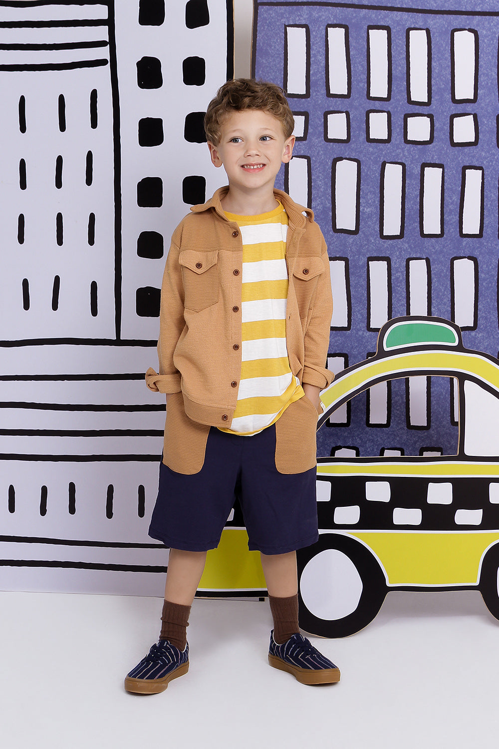 O comprimento da perna é mais tradicional, caindo acima do joelho, conferindo um visual moderno e descontraído. As bermudas são peças fundamentais no guarda-roupa dos meninos, versáteis o suficiente para passeios, atividades esportivas e uso diário escolar.