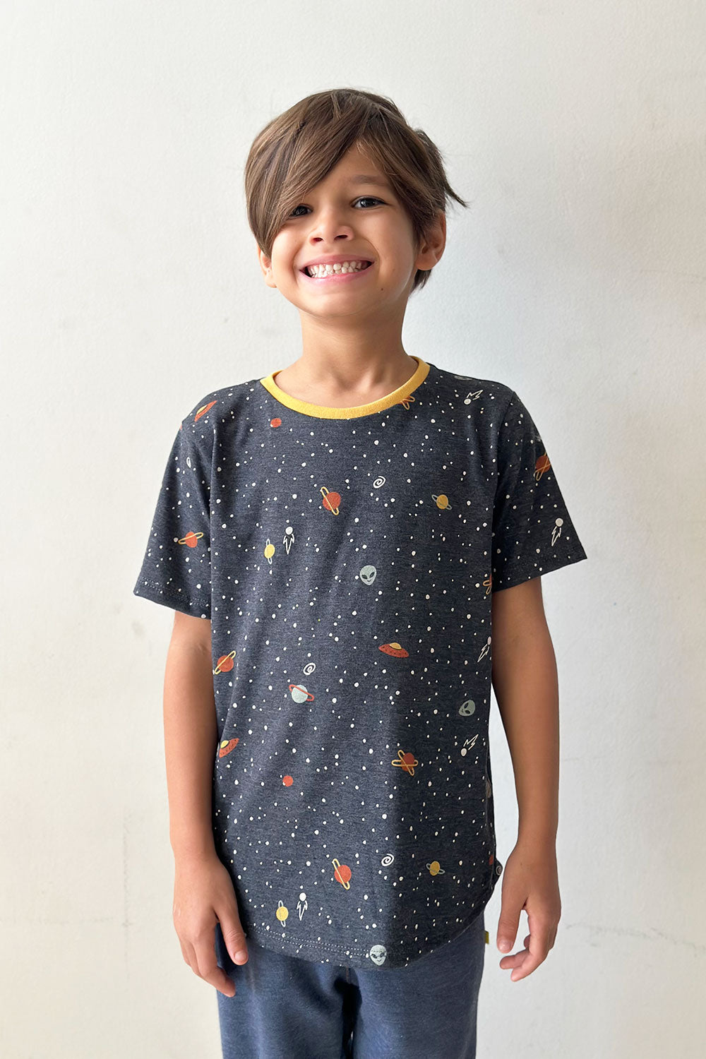 Com malha mescla escura e estampa de cosmos estelar, essa peça traz um toque de mistério e fascínio que as crianças amam.