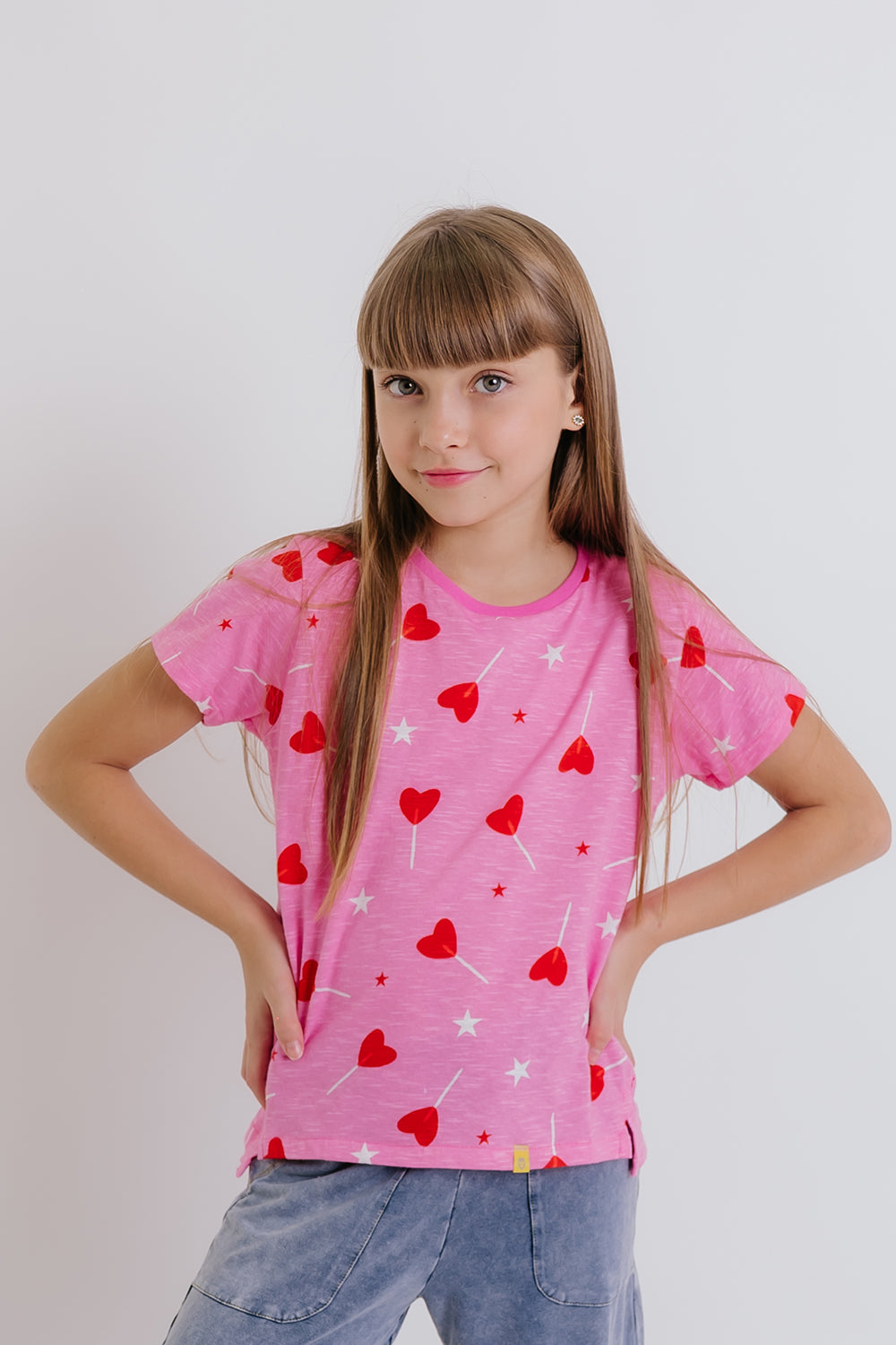 A estampa de pirulitos em forma de coração vermelho é a verdadeira essência da doçura, adicionando um toque encantador ao visual. Cada detalhe foi cuidadosamente pensado para iluminar os dias de diversão.