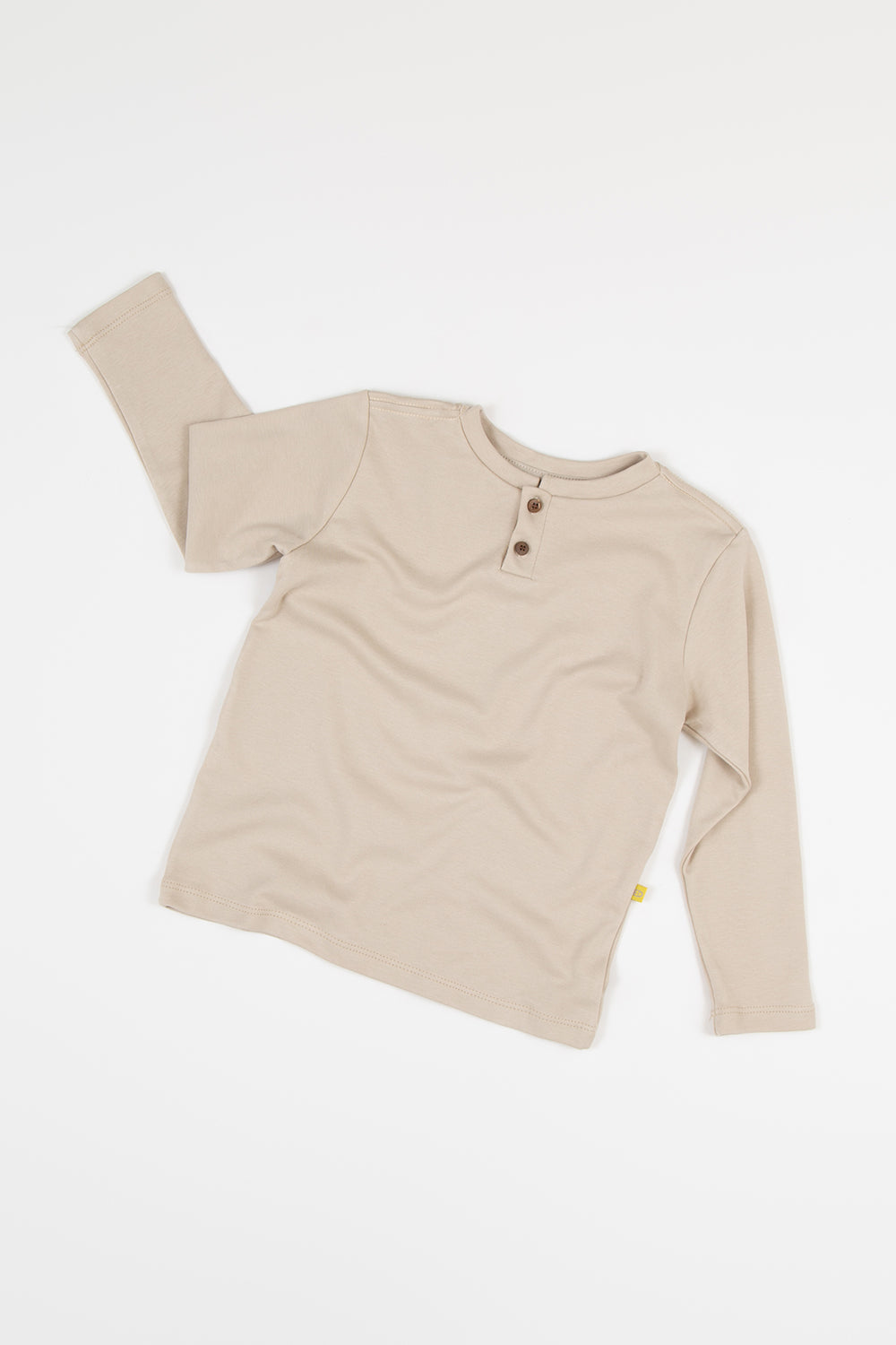 Camiseta infantil manga longa na cor bege que remete à calma da natureza, essa camiseta manga longa é perfeita para os dias mais fresquinhos. Feita em malha de toque macio e aconchegante, traz uma abertura tipo polo com botões de madeirinha — detalhe que adiciona charme e um ar rústico delicado à peça.