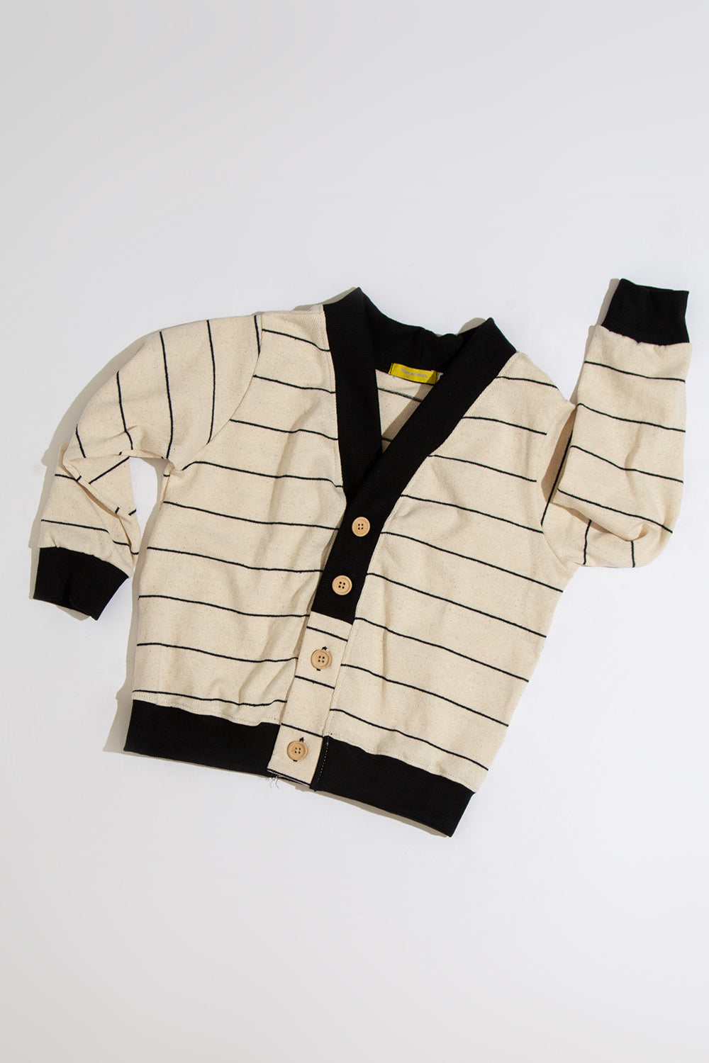 Cardigan em Moletinho Rústico de Fundo Cru com Listrinhas Pretas, uma peça estilosa e versátil para todas as ocasiões. Este cardigan unissex combina um design retrô encantador com a praticidade moderna. Confeccionado em moletinho rústico de alta qualidade, ele oferece conforto e durabilidade. Possui punhos na gola e na barra, garantindo um ajuste perfeito e um toque extra de aconchego. Com seu visual clássico e atemporal, é perfeito para ser usado sobre camisetas, proporcionando um look casual e elegante. Ideal para todas as estações, este cardigan é uma adição essencial ao guarda-roupa de qualquer criança.