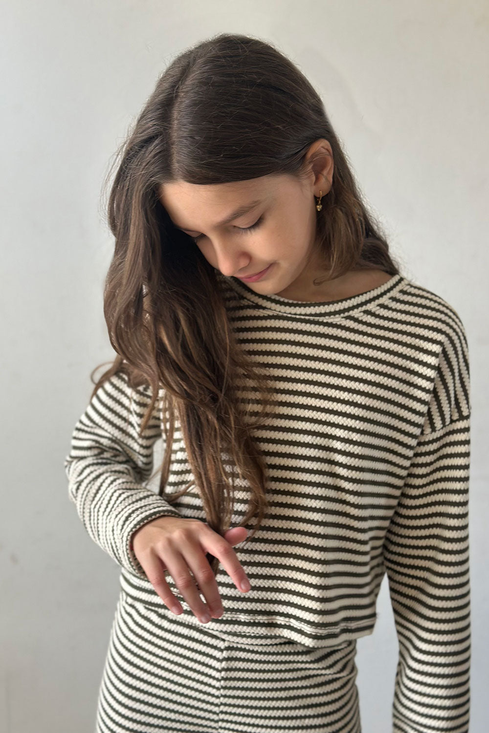 Confeccionado em malha com textura que imita o ponto do tricô, o conjunto transmite um ar aconchegante e despojado. O listrado em off-white com verde oliva traz suavidade à peça, deixando o look ainda mais delicado, ideal para passeios e festinhas.