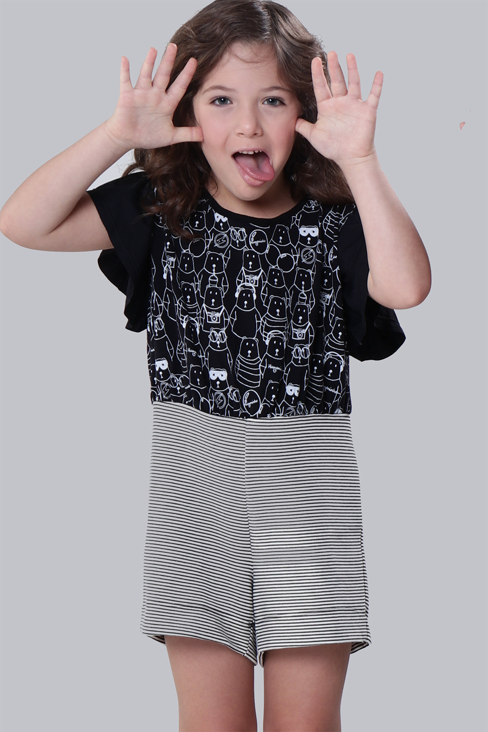 Macaquinho curto com shorts infantil urso. Na parte de cima em malha fininha de viscose estampa preta e branca dos ursos. Parte de baixo shortinhos em malha mais grossa listrado nas cores PB.