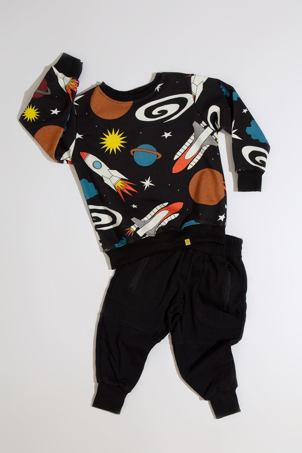 Para formar um conjunto pratico, combine com a nossa calça recortes em moletinho preta. Juntos, eles criarão um look cheio de personalidade e estilo, perfeito para acompanhar as aventuras dos pequenos exploradores do universo!