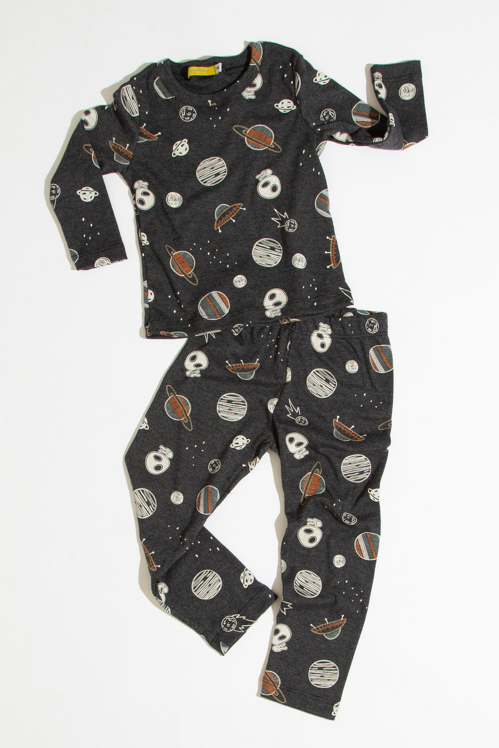 O pijama infantil longo Galáxia, na cor cinza mescla, com estampa temática galáxia com Ets e naves espaciais é uma escolha confortável e aconchegante para as noites de sono dos pequenos. Feito de material macio e respirável, esse tipo de pijama proporciona conforto durante toda a noite, ajudando a manter as pernas e os pés das crianças quentinhos em noites mais frias, garantindo um sono tranquilo.