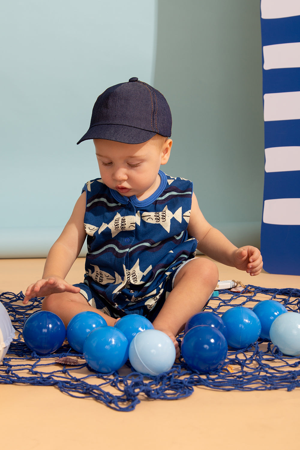 Este macacão para bebês sem mangas é perfeito para os dias mais quentes, com um design prático e divertido. A estampa ilustrada de tubarõezinhos dá um toque lúdico e encantador, ideal para meninos de 3 a 24 meses.
