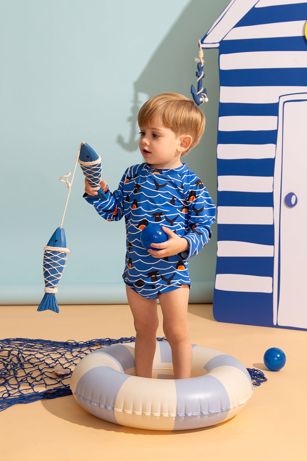 O conjunto é composto por camiseta raglan de manga longa com estampa de tubarão e sunga na mesma estampa, totalmente forrada em tecido antibacteriano, que proporciona mais conforto e cuidado para a pele.