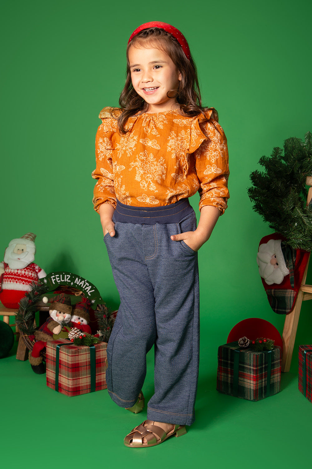 O Conjunto Borboleta chega trazendo todo o charme e aconchego que os dias mais fresquinhos pedem. A bata, confeccionada em algodão leve e macio, encanta com sua cor telha quentinha e a estampa delicada de borboletas — um toque lúdico que ilumina qualquer look. Os babados frontais e as mangas bufantes no estilo princesa deixam a peça ainda mais romântica e especial.