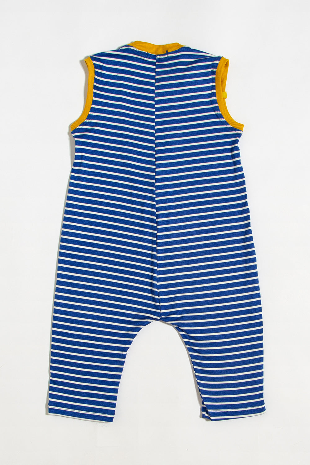 Macacão infantil modelagem saruel longo sem mangas. Possui abertura frontal com botões de madeira. Decote careca com punho em cor contrastante na gola e nas cavas.
