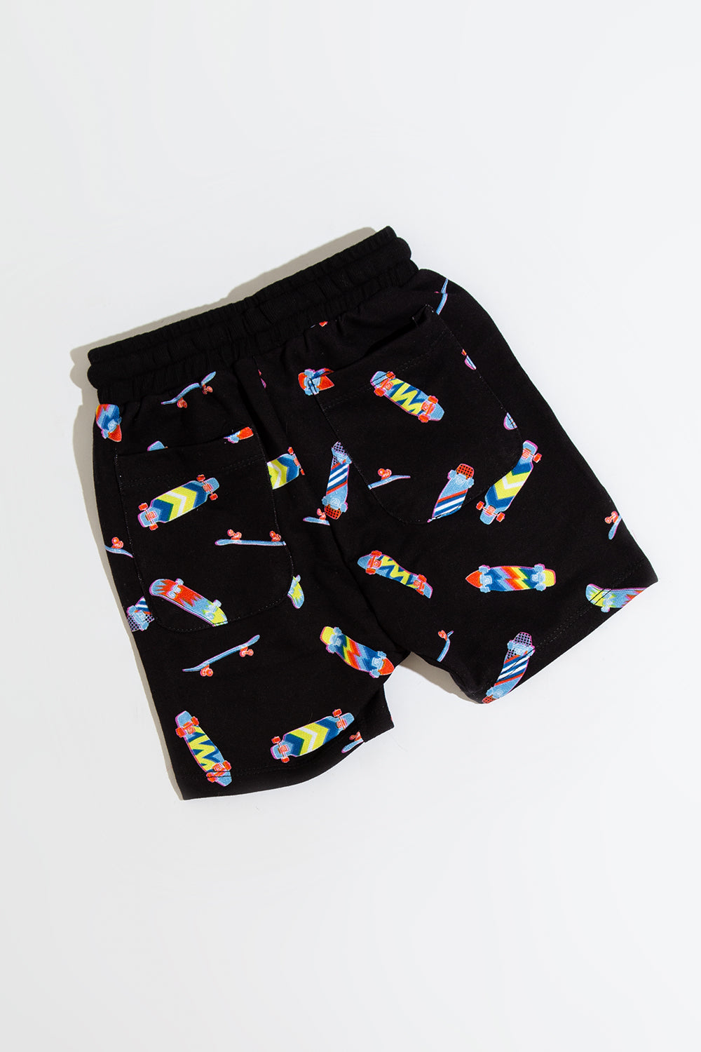 A estampa "Skat Colors" com fundo preto adiciona um toque de estilo único, tornando esta bermuda perfeita para os pequenos amantes de skate.