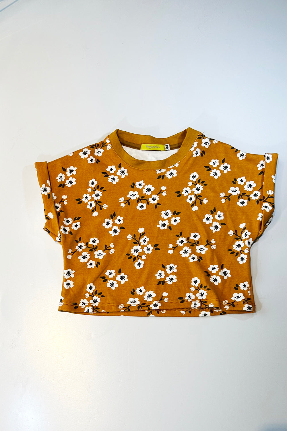 A estampa exclusiva de florzinhas brancas sobre o fundo mostarda remete aos jardins de primavera e deixa o visual leve e divertido.