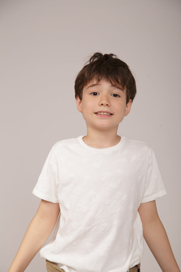 A Camiseta Infantil Coqueiros é a definição de estilo despojado com um toque especial! Apesar de ser branca, não tem nada de básica: os coqueirinhos texturizados por toda a peça trazem um ar superdivertido e moderno.