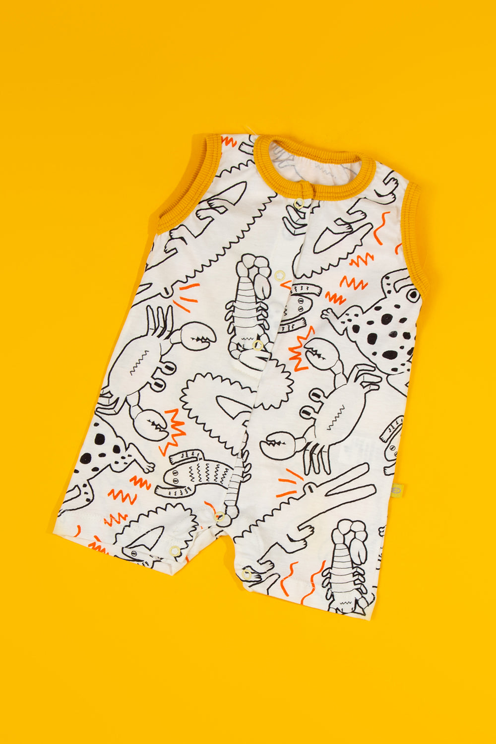 Macacão de comprimento curto, sem mangas e com abotoamento frontal. Para facilitar a troca de fraldas do bebe, possui abotoamento no entrepernas. Confeccionado em malha de algodão macia, proporciona leveza e bem-estar para a pele delicada do bebê.