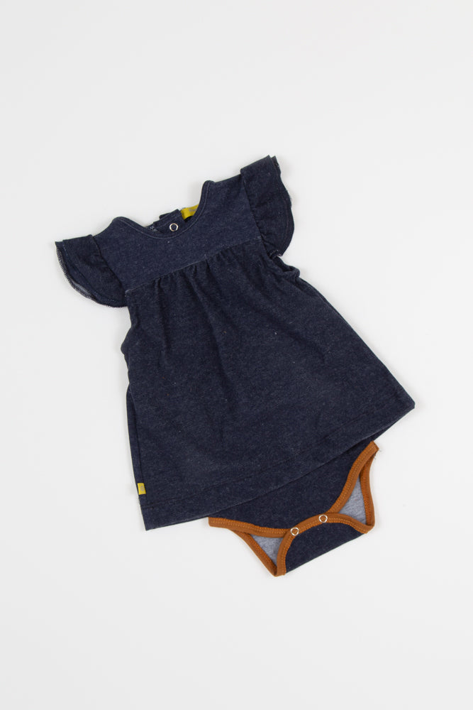 Esse vestido body é feito em malha macia com visual que remete ao denim — o clássico jeans — mas com todo o conforto que os bebês merecem. A modelagem delicada com manguinhas de babado traz charme na medida, enquanto o viés em tom contrastante dá um toque moderno e especial.
